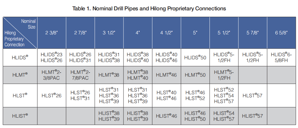 Please refer to Table A.1 or Table B.1 for a list of recommended sizes of Hilong's commonly used drill pipes.